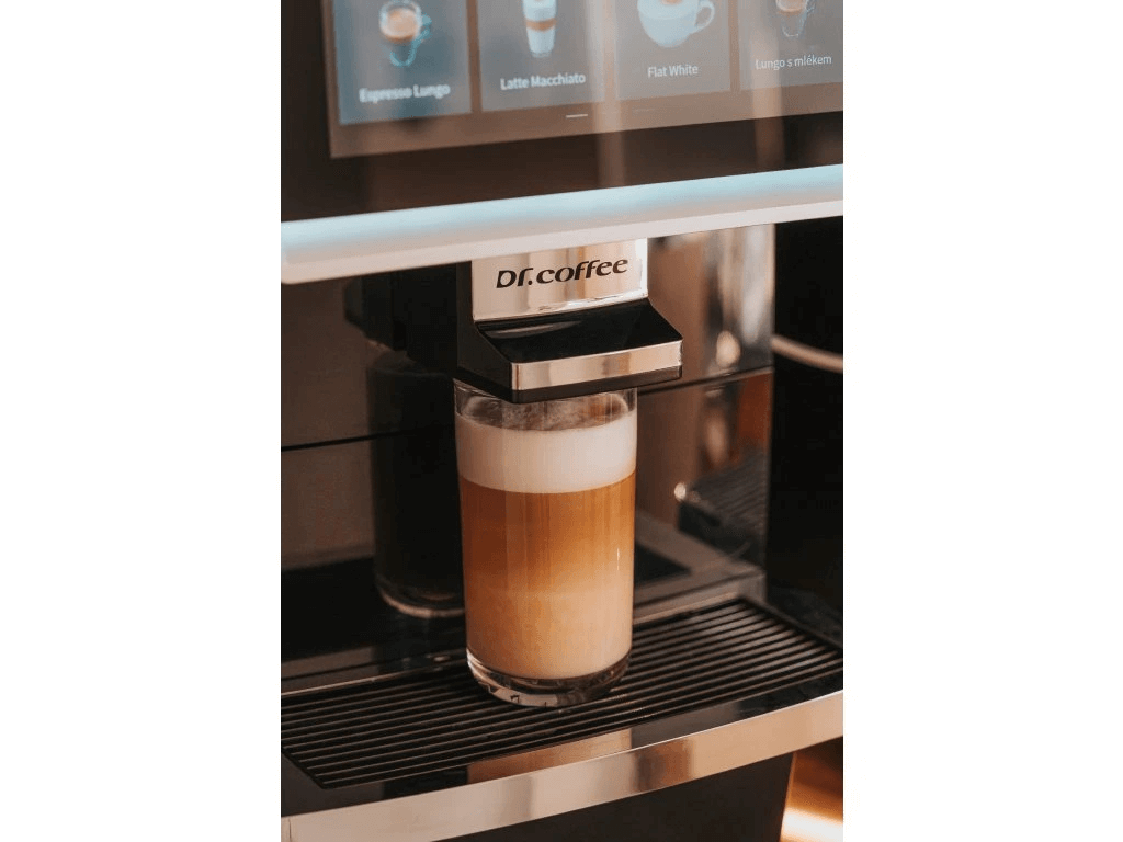 Dr. Coffee Coffeebreak Pro Plus je moderní a výkonný plně automatický kávovar určený pro kanceláře, hotelové lobby, menší provozy a samoobslužné zóny. Vyniká elegantním leskle tmavě šedým provedením a intuitivním ovládáním přes velký barevný dotykový displej, který umožňuje výběr a úpravu široké nabídky kávových specialit i horkých nápojů. Součástí je inteligentní lednice pro uchování čerstvého mléka při optimální teplotě, která je propojena přímo s kávovarem. Lednice umožňuje nepřetržitý provoz bez nutnosti častého doplňování a zajišťuje perfektní pěnu pro cappuccino či latté. Kávovar je vybaven ocelovým mlýnkem s možností nastavení hrubosti mletí, funkcí předspaření a spařovací jednotkou s kapacitou až 16 g kávy, což umožňuje přípravu intenzivních nápojů. Disponuje zásobníkem na 2,5 litru vody, 600 g kávových zrn a nádobou na odpad až pro 18 porcí. Automatické čisticí programy, odvápnění a úsporný režim usnadňují údržbu a prodlužují životnost stroje.